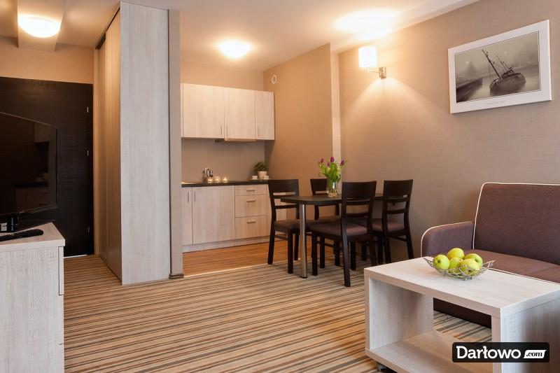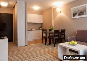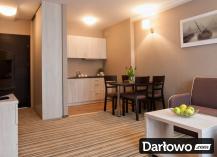 - Apartamenty dodatkowo podzielone są na pokój sypialniany i pokój dzienny z aneksem kuchennym i zestawem wypoczynkowym.